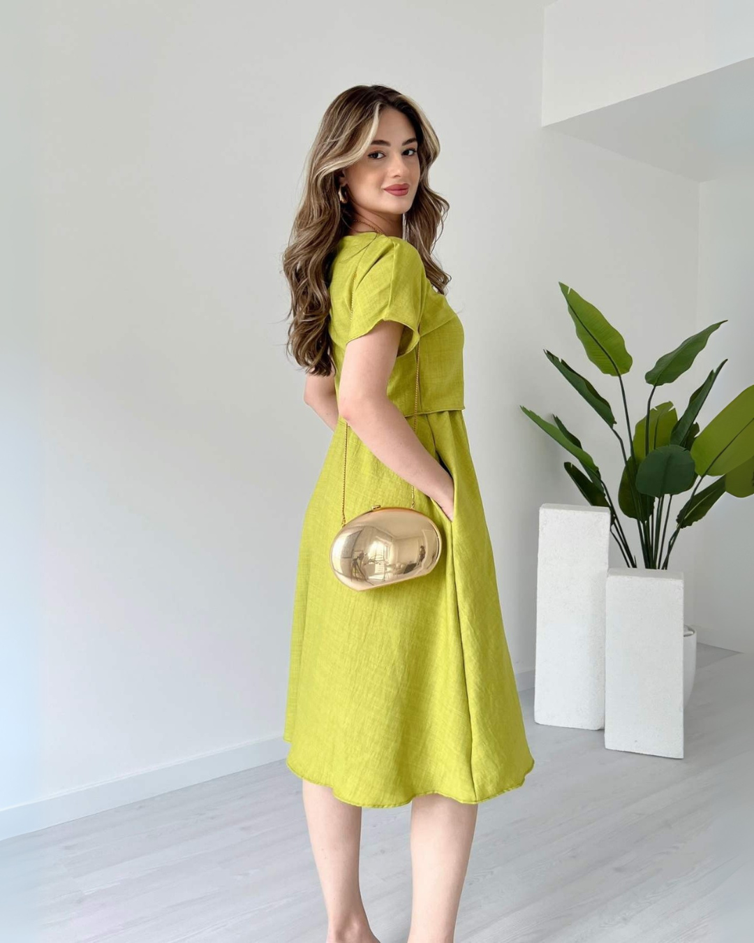Everyday wear dress in lively green, featuring handy pockets and a comfortable, easy-to-move fit.
